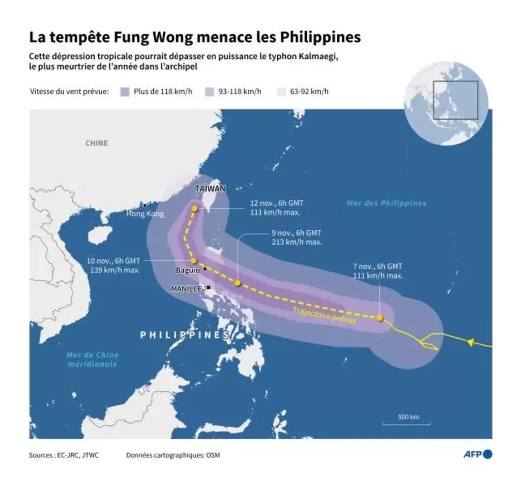 Fung-wong devrait déverser "des précipitations de 200 millimètres ou plus, qui peuvent provoquer des inondations étendues, pas seulement dans les zones de basse altitude", a mis en garde Benison Estareja, un météorologue du gouvernement, lors d'une conférence de presse.