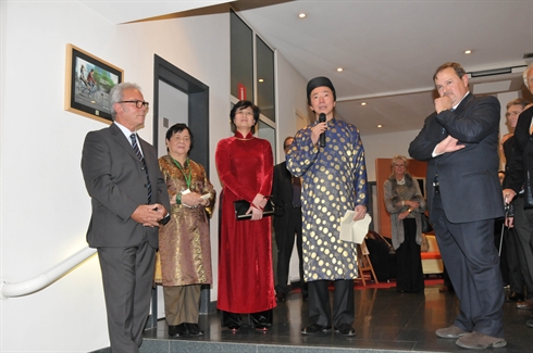 | L’ambassadeur du Vietnam en Belgique, Pham Sanh Châu (Centre), inaugure l’exposition «La symphonie des couleurs» à Bruxelles. |
