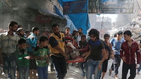| Des Syriens transportent le corps d'un homme tué après des bombardements aériens sur le quartier Fardous, dans le nord d'Alep, le 12 octobre. |