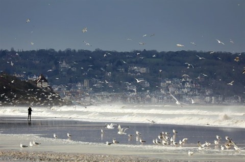 | La plage de Deauville et ses mouettes, le 1er janvier en France. |