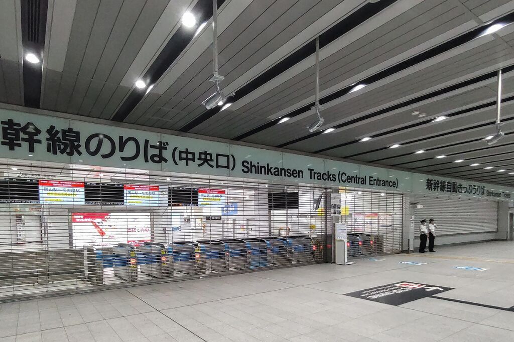 | Les grilles fermées menant aux quais du train à grande vitesse "shinkansen", à la gare d'Osaka, pendant le passage de la tempête tropicale Lan, le 15 août au Japon. |