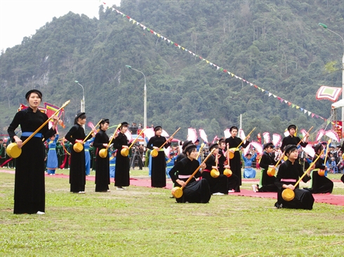| Les femmes Tày en tenue traditionnelle lors d’un spectacle de hat then, un chant rituel. |