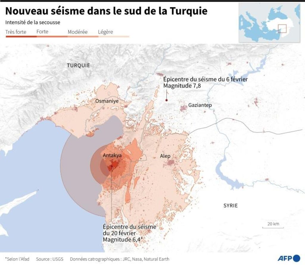 La première secousse, de magnitude 6,4 et avec pour épicentre Defne, un district proche d'Antakya (Turquie), est survenue à 20h04 (17h04 GMT) et a été très violemment ressentie par les équipes de l'AFP à Antakya et à Adana, 200 km plus au Nord. Elle a été suivie trois minutes plus tard d'une nouvelle secousse de magnitude 5,8 à Samandag, localité côtière plus au sud.