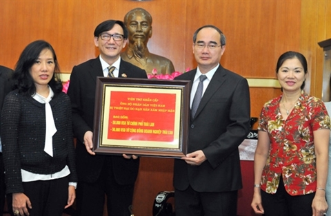 | L’ambassadeur de Thaïlande au Vietnam, Manopchai Vongphakdi (gauche), a remis le 14 juin, à Hanoi, une somme de 100.000 dollars. |