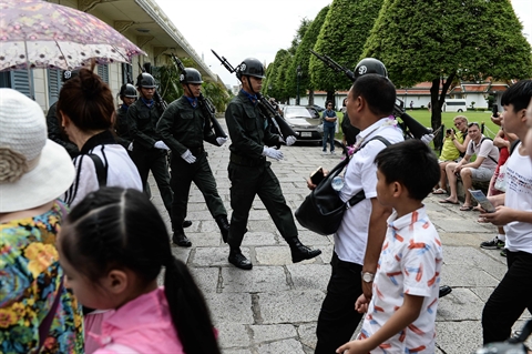 | La police thaïlandaise patrouille à Bangkok, le 14 août. |