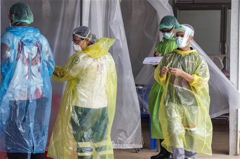 | Des agents médicaux prélèvent les échantillons pour le test rapide du COVID-19 à la province de Yala au Sud de la Thaïlande. |