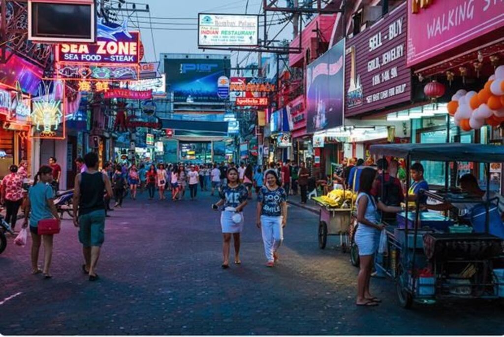 | Les touristes marchent dans la rue piétonne de Pattaya. |