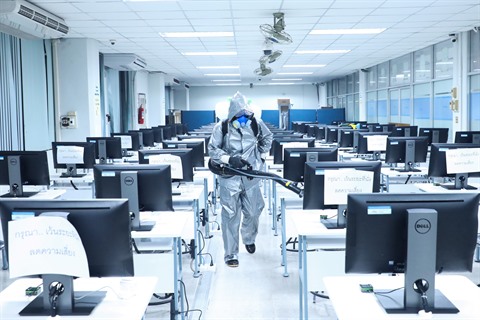 | Un soldat effectue la désinfection d'une salle d'ordinateurs le 24 mars à Bangkok, en Thailande. |