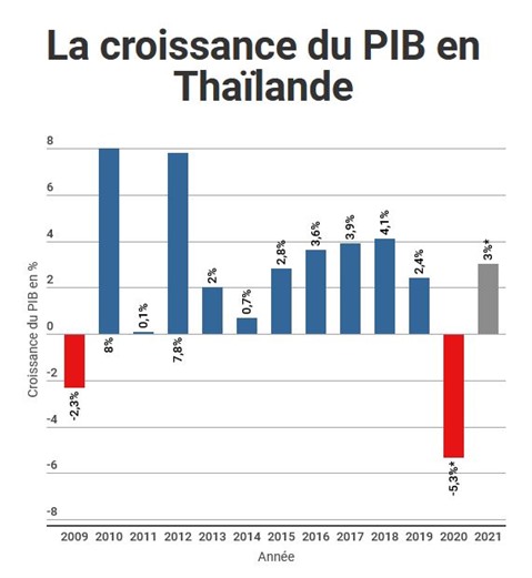 Le PIB thaïlandais pourrait régresser de 5,3% en 2020, une forte baisse par rapport aux projections précédentes de 2,8% en décembre, a estimé la banque dans un communiqué de presse. L’inflation globale devrait également se contracter avec une valeur négative de -1% au lieu des projections précédentes de 0,8%.