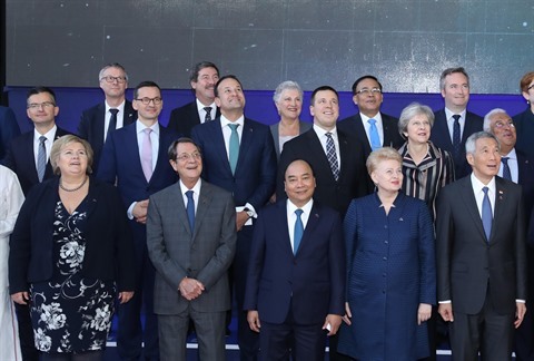 | Le Premier ministre Nguyên Xuân Phuc (premier plan, centre) pose avec les dirigeants des pays de l'ASEM à Bruxelles. |