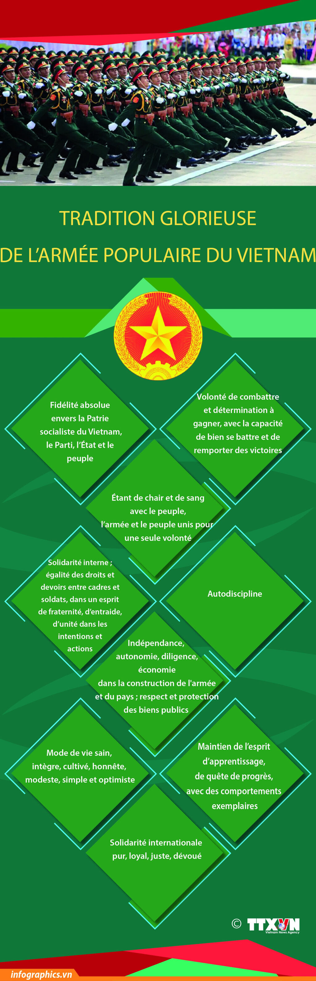 "L'armée vietnamienne est fidèle au Parti, dévouée au peuple, toujours prête à combattre et à se sacrifier pour l’indépendance et la liberté de la Patrie, pour le socialisme. Elle accomplit toutes les missions, surmonte toutes les difficultés et vainc tous les ennemis", selon le Président Hô Chi Minh.