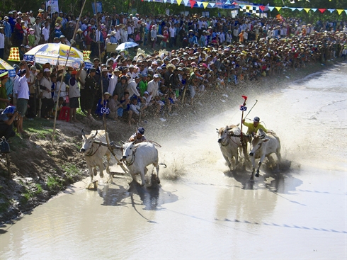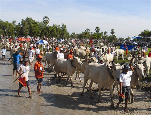 Les purs sangs et leurs jockeysLes bœufs sont comme des purs sangs, et leurs «jockeys» sont de hommes très expérimentés, qui commandent leurs animaux avec sang-froid. Les spectateurs attendent la victoire de la paire de bœufs de leur village, qui rejaillira sur toute la communauté. Les animaux seront alors entretenus et considérés comme un trésor, de la famille et même du village. Car selon les Khmers, les bœufs gagnants apporteront au village joie et chance. Avec cette victoire, les villageois peuvent espérer de bonnes moissons. Cette course a pris au fil des années une dimension de plus en plus importante. En 1991, elle a vu s’affronter, par bœufs interposés, des districts, puis ensuite des provinces. «La course répond aux besoins de distraction des Khmers et de la population toute entière, toutes ethnies confondues», selon Châu Song, propriétaire d’une paire de bœufs, du quartier d’An Loi, commune d’An Hao, district de Tinh Biên, province d’An Giang. Et d’ajouter : «Les locaux sont toujours enthousiastes de participer car les moissons et la période des crues sont terminées. Après la course, ils reprennent le travail».