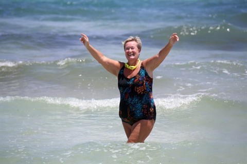 | Une touriste européenne se baigne dans une plage de l’île tunisienne de Djerba le 18 juillet, au lendemain de l’arrivée des premiers vols charters vers le pays depuis l’éclatement de la crise du nouveau coronavirus. |