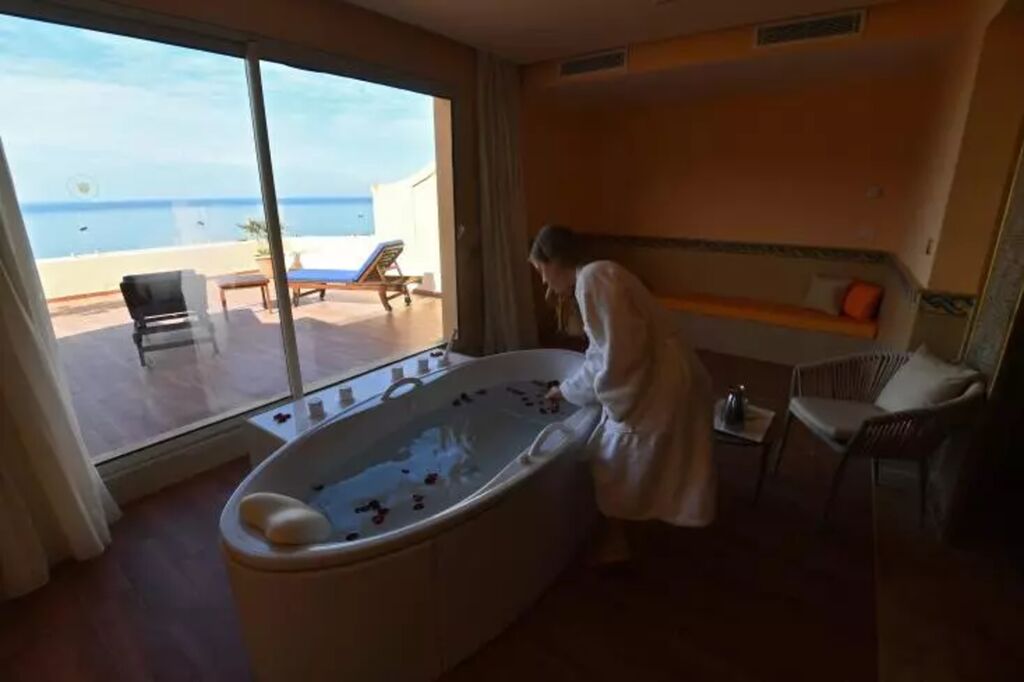 Rouaa Machat, 22 ans, est venue de France pour une cure de trois jours afin de "profiter des trois eaux" de Korbous : l'eau de mer, l'eau de source - l'antique Carpis possède six sources - et l'eau douce (eau de mer désalinisée). "Et je suis là aussi pour ça", dit cette Franco-Tunisienne en montrant le panorama sur mer et montagne qu'elle peut admirer dans son jacuzzi à travers une cabine vitrée.