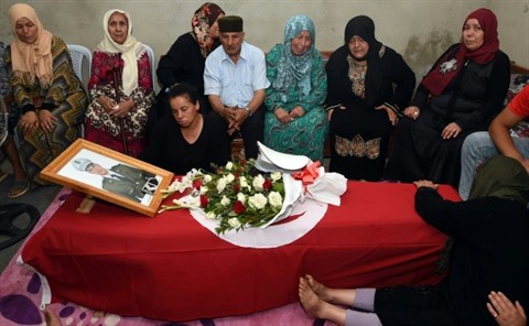 Des collègues de l'un des six membres des forces de l'ordre tués dans le Nord-Ouest de la Tunisie au cours d'une attaque "terroriste", le 8 juillet à l'hôpital Charles Nicole de Tunis. Photo: AFP/VNA/CVN |