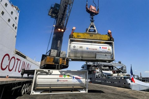 | Les réservoirs d'oxygène fournis par la France à la Tunisie déchargés au port de Radès proche de Tunis, le 22 juillet. |