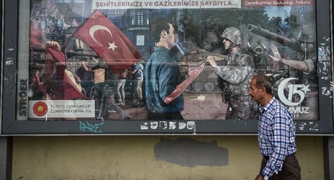 | Un homme passe devant une affiche "La légende du 15 juillet", à la veille de l'anniversaire de la tentative de coup d' |