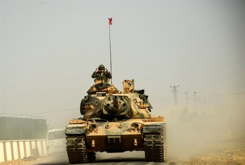 | Des chars turcs se dirigent vers la frontière syrienne, le 25 août à hauteur de Karkamis, dans la région de Gaziantep. |