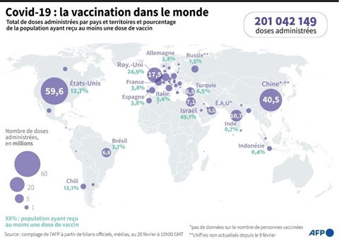 | Plus de 200 millions de doses de vaccin contre le COVID-19 administrées dans le monde, données au 20 février. |