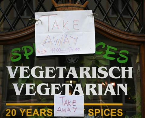 | Un restaurant précise qu'il propose des plats à emporter à Salzbourg, en Autriche, le 17 novembre. |