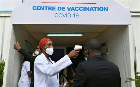 | Prise de température à l'entrée d'un centre de vaccination contre le COVID-19 au Palais des sports d'Abidjan, en Côte d'Ivoire, le 1er mars. |