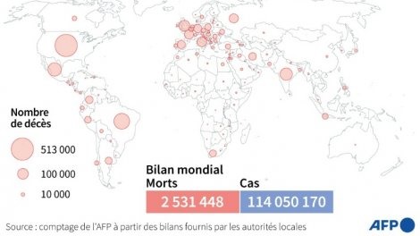 La pandémie a fait au moins 2,53 millions de morts dans le monde, selon un bilan établi par l'AFP lundi 1er mars. Et l'Organisation mondiale de la santé (OMS) a prévenu qu'il était "irréaliste" d'espérer en finir avec le coronavirus d'ici fin 2021, surtout avec la nouvelle hausse du nombre de cas ces derniers jours, après sept semaines consécutives de baisse.