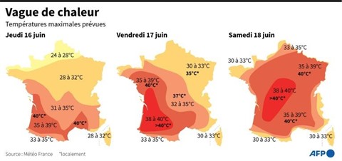 | Températures prévues par Météo France pour la vague de chaleur qui va toucher la France jusqu'au 18 juin. |