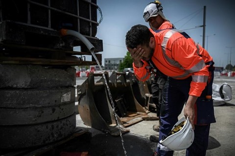 | Des ouvriers sur un chantier se rafraîchissent avec de l'eau, le 14 juin à Mérignac, près de Bordeaux. |