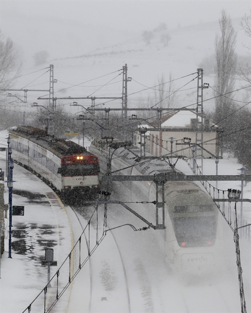 | Un train passe sous la neige à la station de Aguilar de Campo le 3 février dans le Nord de l’Espagne. |