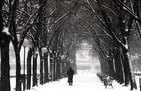 | Un homme marche sous la neige dans le parc de la ville de Skopje le 6 février en Macédoine. |
