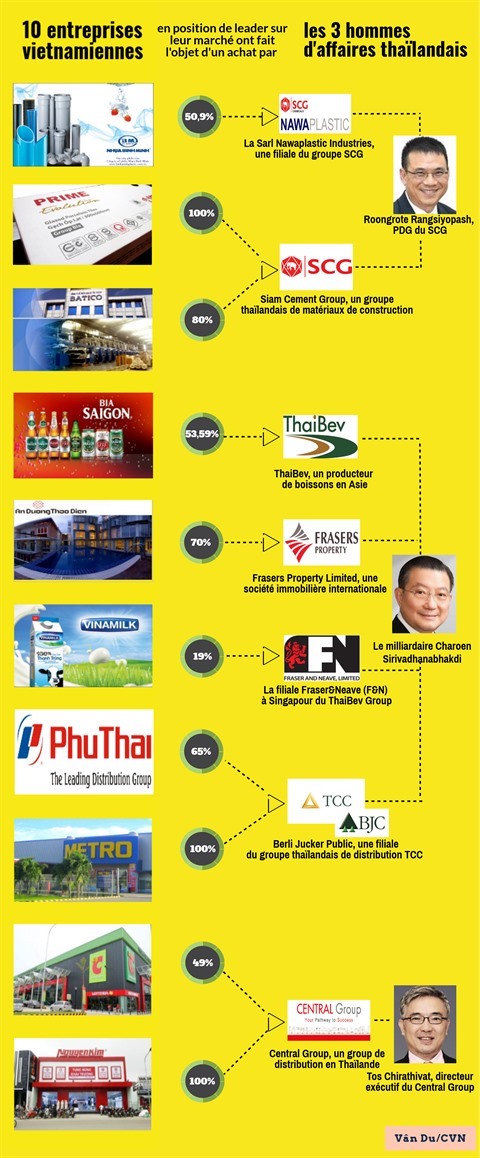 L’acquisition par le groupe thaïlandais ThaiBev d’une participation de 54% dans le capital du plus gros fabricant de bière du Vietnam, Sabeco, fut l’opération la plus importante de 2017, estimée à 4,89 milliards de dollars américains. En outre, d’autres grosses transactions ont concerné la société Jardine Cycle & Carriage Limited de Singapour avec l’achat de 12,8 millions d’actions supplémentaires, d’une valeur d’un milliard de dollars, du groupe Vinamilk ; ou celle du groupe sud-coréen CJ, qui a acquis 2 entreprises de logistique vietnamienne, pour 85 millions de dollars.