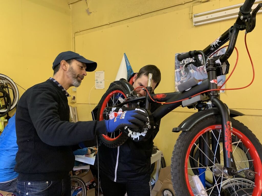 | Deux bénévoles réparent un vélo avant la remise au locataire. |
