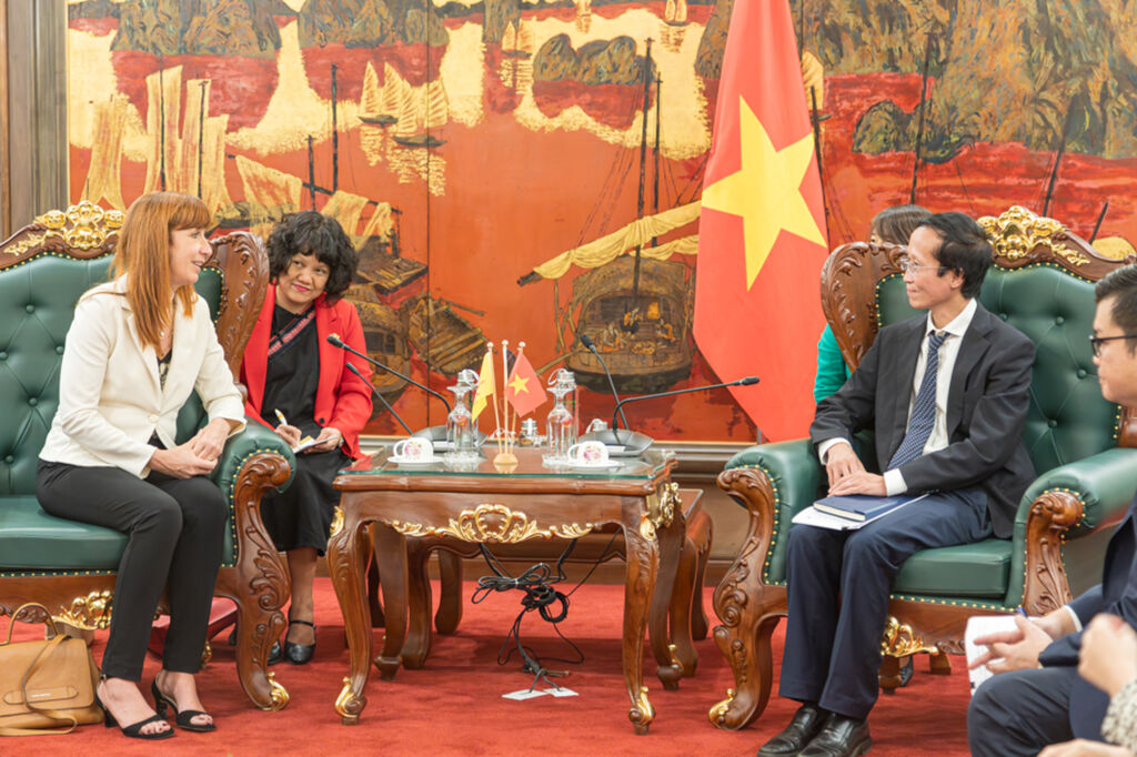 | Signature de la lettre d’intention entre le Département de promotion du commerce (VIETRADE) et l'AWEX le 27 novembre 2023 à Hanoï, dans le cadre de la visite de sa directrice générale, Pascale Delcomminette (droite), au Vietnam. |