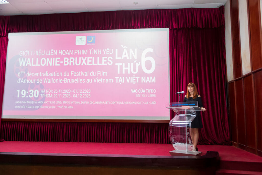 | Mme Delcomminette prend son discours lors de l'ouverture de la 6e édition du Festival du film d'amour de Wallonie-Bruxelles à Hanoï, le 26 novembre 2023. |