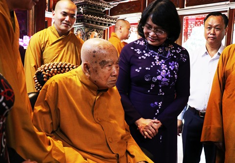 | La vice-présidente Dang Thi Ngoc Thinh rend visite au Vénérable Thich Thanh Tu, vice-président du Comité du Sangha de l’Église bouddhique du Vietnam. |