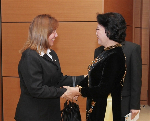 | La vice-présidente de l'Assemblée nationale du Vietnam, Nguyên Thi Kim Ngân (droite) et son homologue cubain Ana Maria Machado, le 27 mars à Hanoi. |