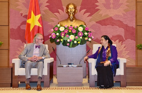 | La vice-présidente de l’AN vietnamienne Tong Thi Phong et l'ancien secrétaire général de l'UIP, Anders Johnsson, le 5 avril à Hanoï. |