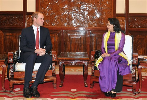| La vice-présidente du Vietnam, Dang Thi Ngoc Thinh (droite), reçoit le Duc du Cambridge, Prince William Arthur Philip Louis. |