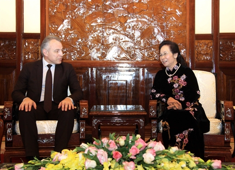 | La vice-présidente du Vietnam, Nguyên Thi Doan, et le président de la Fédération des syndicats de la Biélorussie, Mikhail Orda, le 24 novembre à Hanoi . |