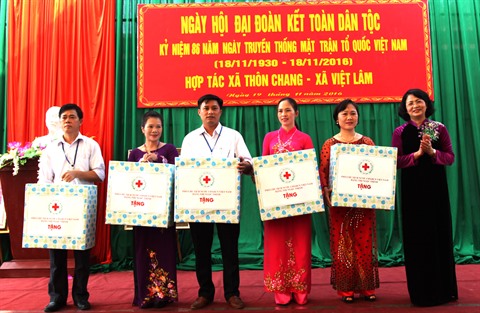 | La vice-présidente de la République, Dang Thi Ngoc Thinh (1er à droite), lors de la célébration de la Journée de la grande union nationale à Hà Giang (Nord). |