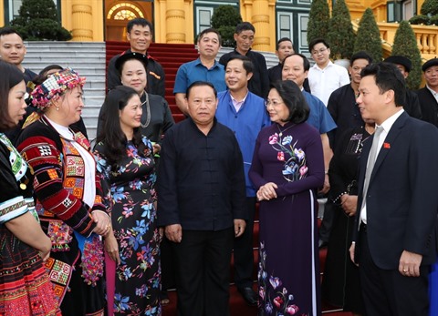 | La vice-présidente de la République, Dang Thi Ngoc Thinh (2e, droite), et des représentants des minorités ethniques de la province de Hà Giang. |
