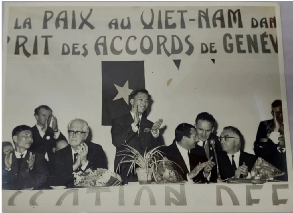 | Le colonel-ambassadeur Hà Van Lâu assiste à un meeting organisé en 1963 en France pour soutenir la mise en œuvre par le Vietnam des Accords de Genève. |