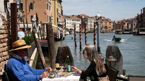 | Des touristes attablés à une terrasse d'un restaurant à Venise, le 21 mai. |