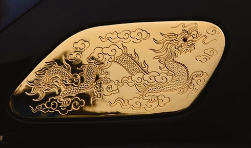 Outre le dorage, le propriétaire a demandé de graver des dragons sur le couvercle du coffre et la grille de la calandre car il s’agit d’une Rolls-Royce édition «Year of the Dragon» (Année du Dragon). Et au bout du long capot brossé et doré, trône, majestueuse, la figure «Spirit of Ecstasy» (Esprit de l’extase), emblème du constructeur automobile Rolls-Royce, dorée elle aussi.
