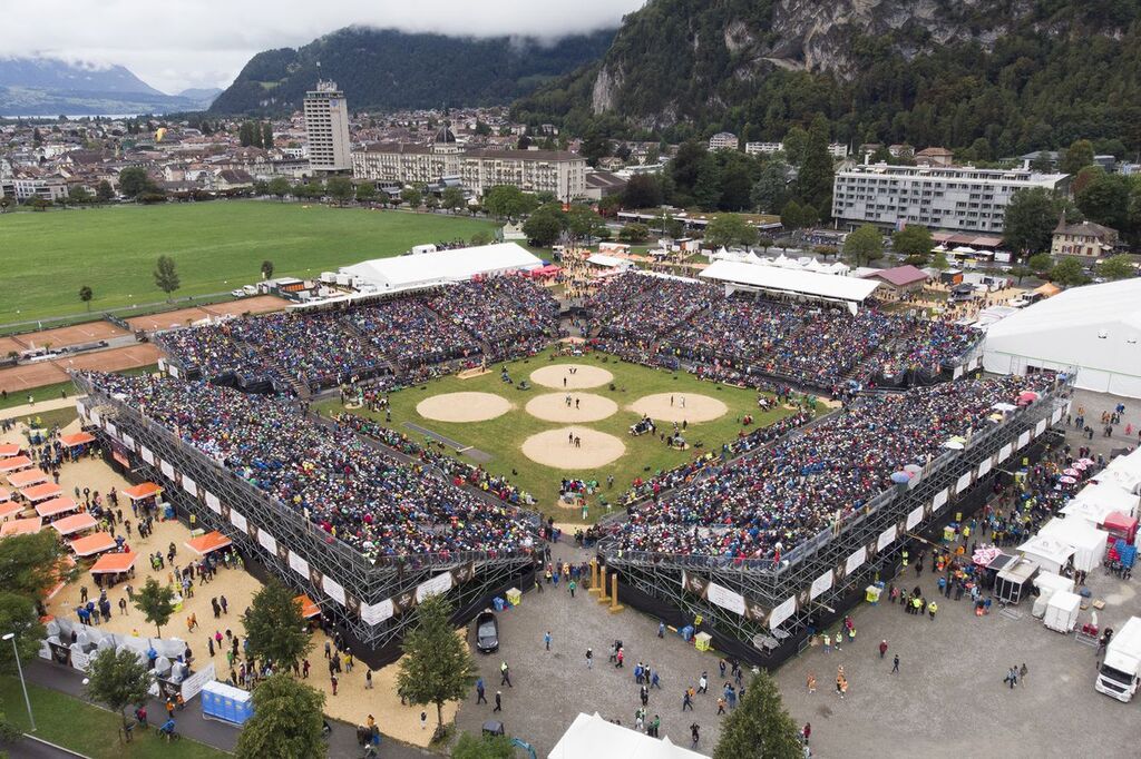| Vue de la place de lutte lors de la lutte d'Unspunnen 2023, le dimanche 27 août sur la Hoehenmatte, à Interlaken. |