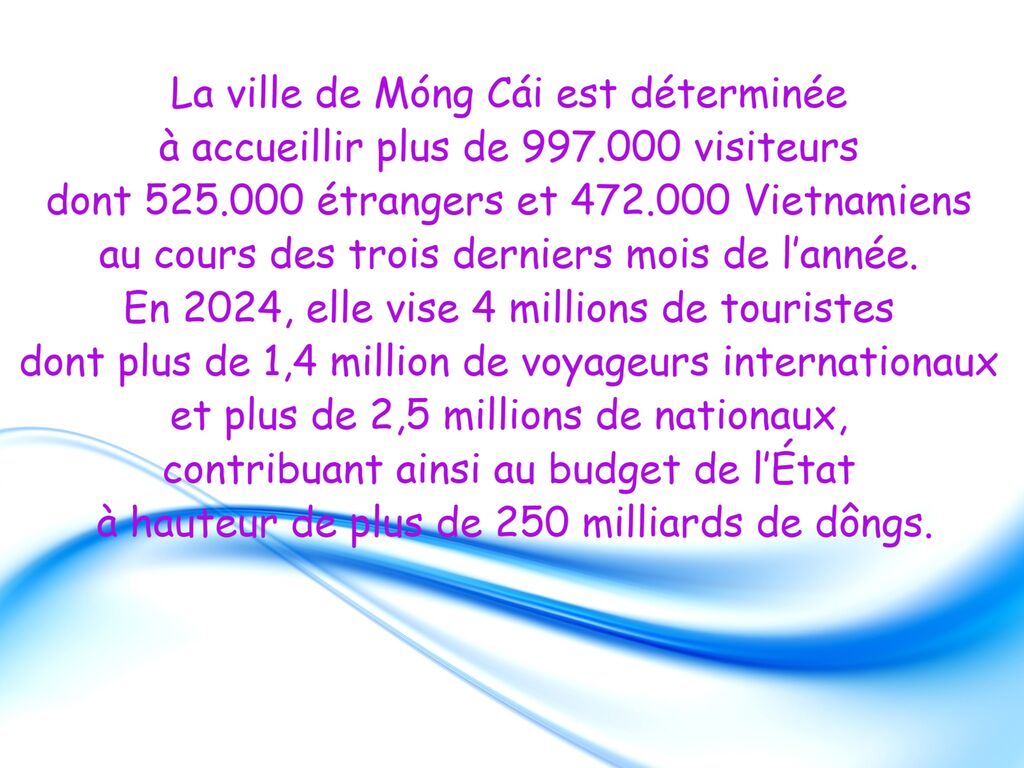 La ville a organisé avec succès un programme de perfectionnement et de sensibilisation à la communication, à la transformation numérique et aux statistiques dans les activités touristiques. Elle se concentre sur l’investissement et le développement de nouveaux produits touristiques en 2024 comme l’élargissement des rues piétonnes du quartier de Trân Phú, le tourisme de villégiature haut de gamme pour les visites de sites culturels et historiques associées à l’expérience de la cuisine sino-vietnamienne et à la contemplation de feux d’artifice sur la rivière frontalière.