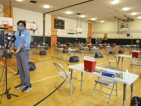 | Le commissaire à la Santé de la ville de New York Ashwin Vasan s'exprime, le 17 juillet, dans le gymnase d'un lycée de Brooklyn transformé en site de vaccination contre la variole du singe. |