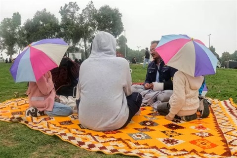 Autour de lui et de ses amis, des familles profitent de l'air frais et les enfants jouent alors qu'ailleurs dans le pays, ils doivent rester confinés dans les intérieurs climatisés.