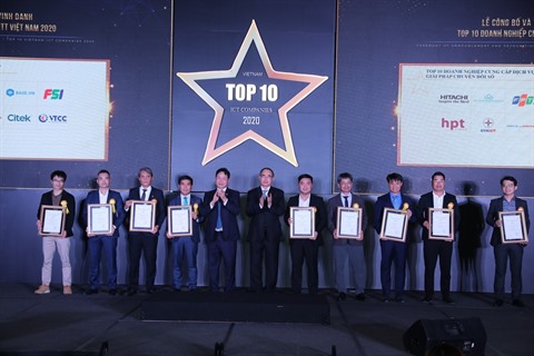 | Des représentants des 10 entreprises leaders dans le domaine des TI en 2020 lors de la cérémonie tenue le 14 décembre à Hanoï. |