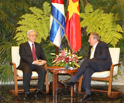 | Le secrétaire général du Parti communiste du Vietnam, Nguyên Phú Trong (gauche), et le général Raul Castro Ruz, premier secrétaire du Parti communiste de Cuba. |